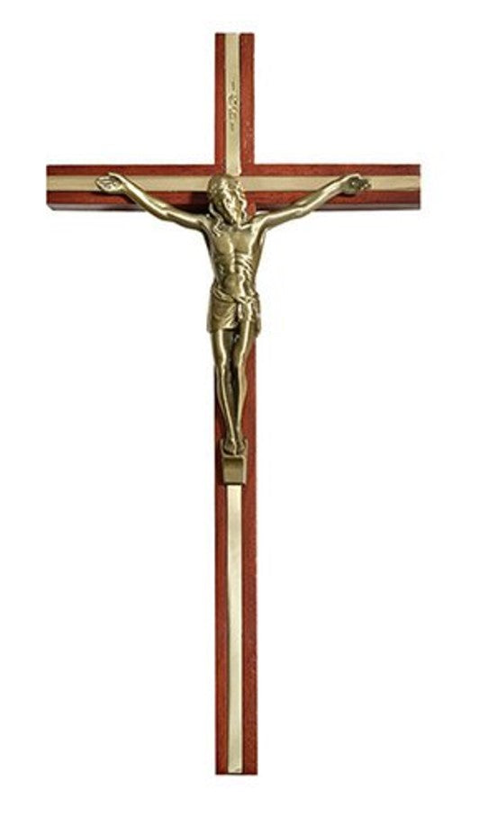 This crucifix from Jeweled Cross features a walnut finish cross, a brass inlay and a gold finish corpus. Comes in a 2-piece gift box for easy gift-giving and a keyhole on the back for easy hanging.