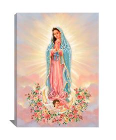 Introducing the breathtaking Our Lady of Guadalupe Canvas Wall Art, a stunning portrayal of the revered Mother Mary. With hands folded in prayer, she stands serenely on a bed of clouds, her gentle presence illuminating the entire piece. Delicate flowers cascade below her, while a young angel gracefully flutters beneath her feet, adding to the ethereal aura of this masterpiece. Expertly crafted with the finest attention to detail, this canvas wall art captures the essence of devotion and grace. The soft, warm hues of the painting radiate a sense of peace and tranquility, making it the perfect addition to any space in need of a little calm and comfort.