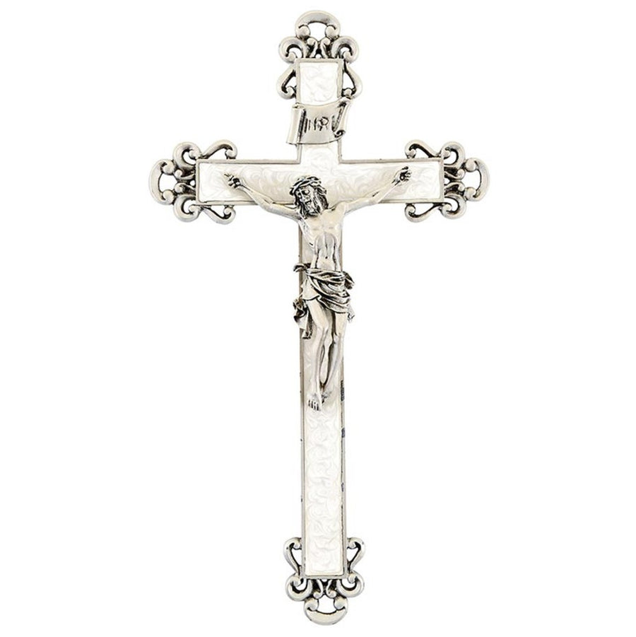 This crucifix from Jeweled Cross features a pearlized white epoxy cross and an antique pewter finish corpus. Comes in a 2-piece gift box for easy gift-giving and a keyhole on the top for easy hanging.