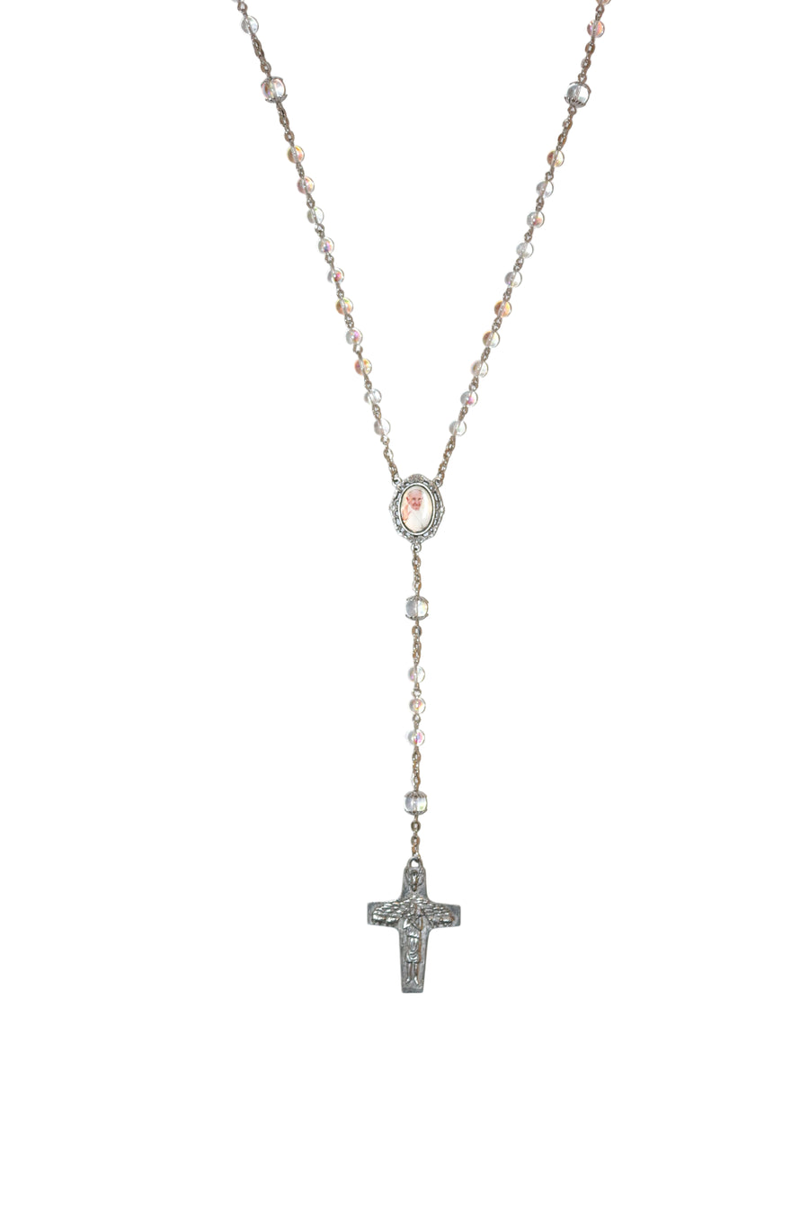 This 22" rosary features shimmering AB glass crystal beads that catch the light with every movement. A central medallion showcases an image of Pope Francis, leading to a silver tone pendant of The Good Shepherd at the end. Thoughtfully designed for prayer and reflection, it blends spiritual significance with a subtle, radiant charm.