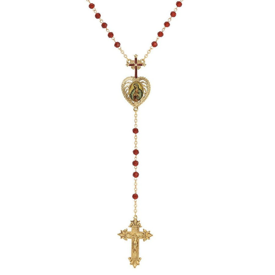 Symbols Of Faith Siam Red Crystal Our Lady of Guadalupe & Crucifix Rosary Necklace