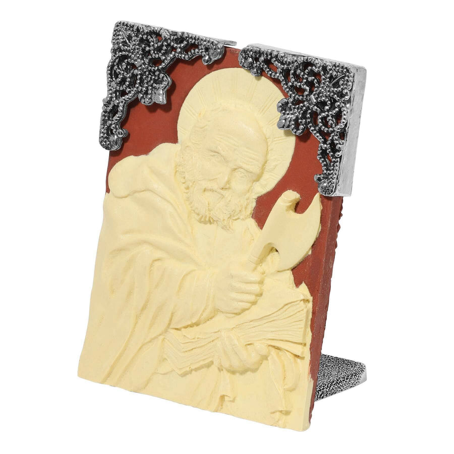 This table plaque boasts intricate filigree detailing, showcasing a striking portrayal of St. Jude in carnelian red and ivory hues. The depiction captures the saint holding an axe, symbolizing his martyrdom with poignant reverence. A sophisticated addition to any space, this piece intertwines artistic flair with historical significance, inviting contemplation and admiration alike.