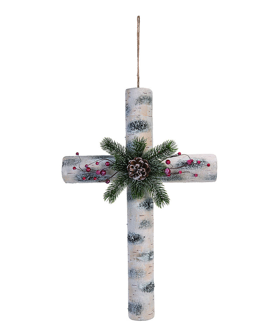Deck the halls of your home with this birchwood cross accented with pinecones and berries that effortlessly hangs on your wall for a winter wonderland vibe.