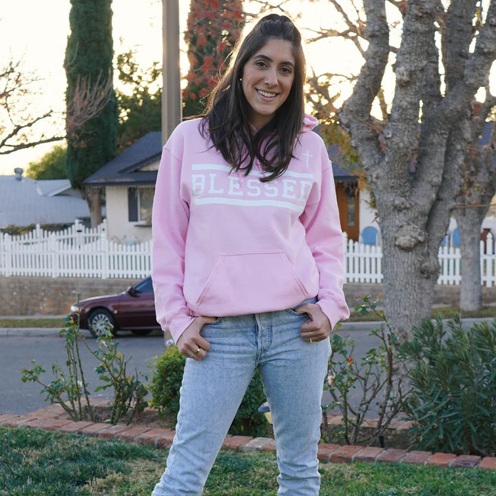 One of our most popular hoodies. This light pink Blessed Hoodie has a thick print that will last, plus a bold faith filled design. Get ready to stay cozy and warm while sharing your faith. Next time someone asks "how you are doing?" say, "I'm blessed!".
