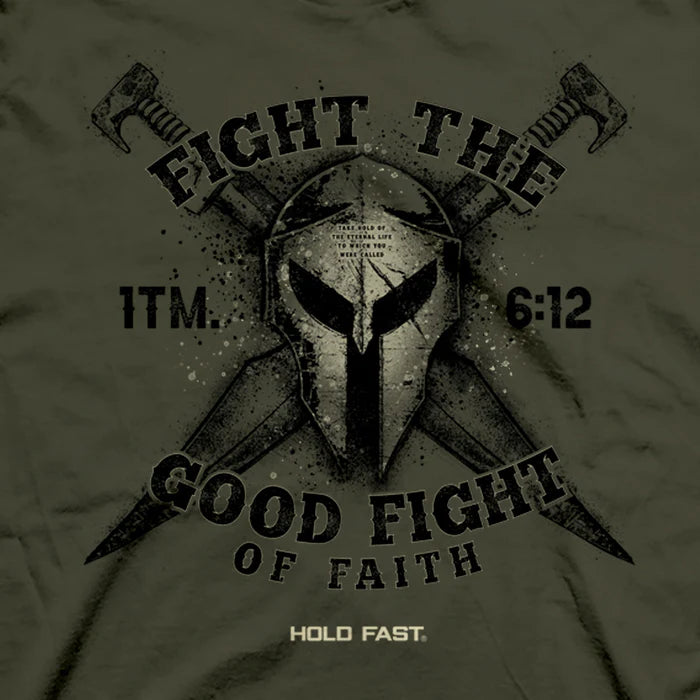 Take a stand in this rugged “Fight The Good Fight” T-shirt by HOLD FAST® in Moss/Military. A life of faith sometimes means defending what we believe in, and holding fast to the Good News about Jesus Christ. Don’t stand down—hold your ground in the fight for your faith.