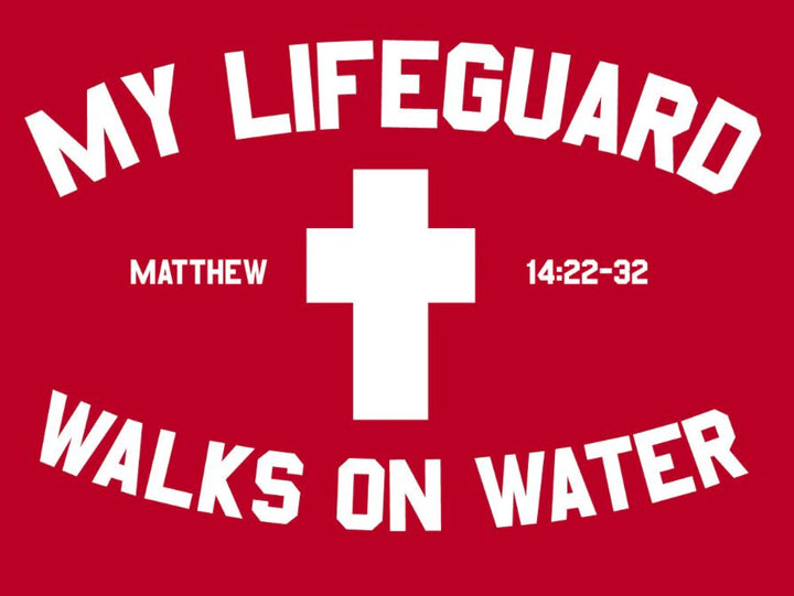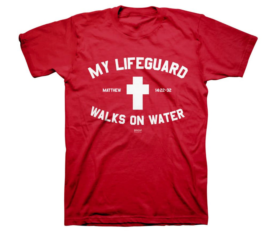 Put your courage on display in this Kerusso® My Lifeguard Walks on Water T-Shirt in Red that will remind you—and anyone who sees your bold shirt—that God is with you, and you need not fear the deep end of the pool—or anything life can throw at you.
