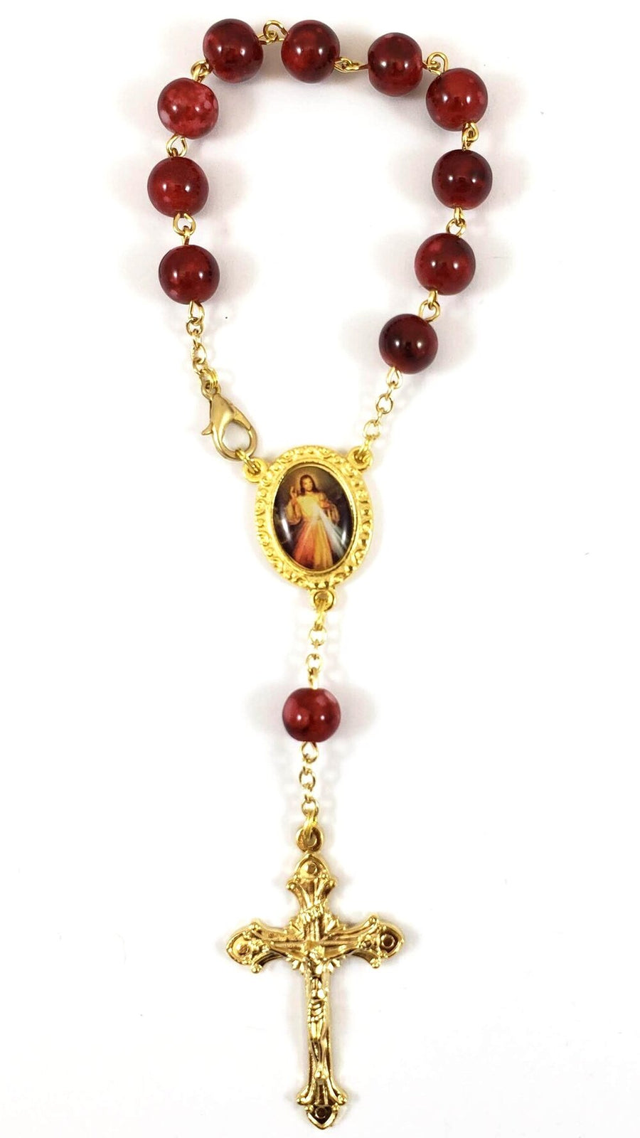 Beautiful Divine Mercy single decade car rosary with red glass beads and gold color pewter centerpiece and crucifix.