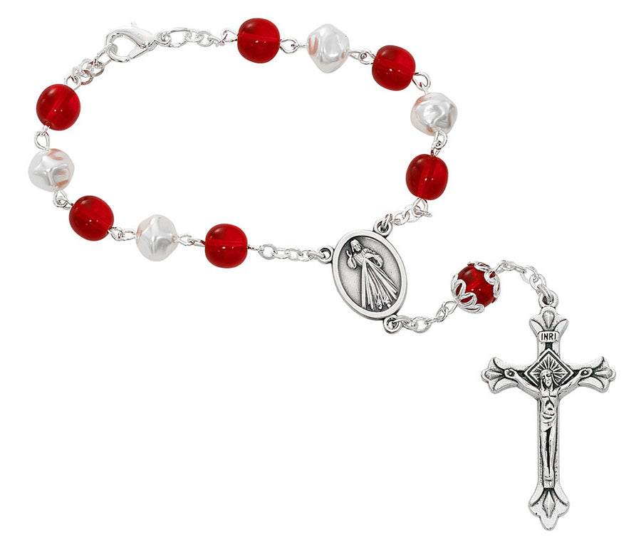 8MM Red and White Pearl Glass Beads with Silver Oxidized Crucifix and Center. Comes Carded. Made in Italy
