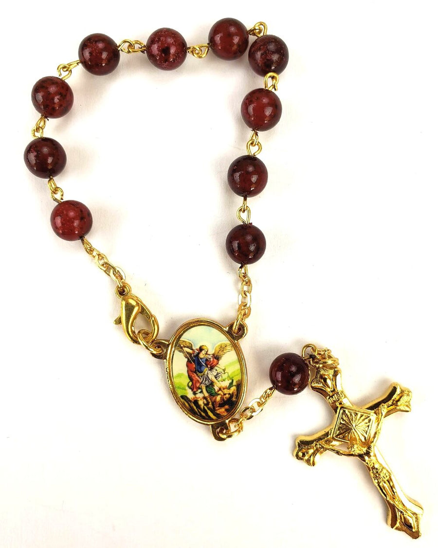 Beautiful Saint Michael the Archangel single decade car rosary with 8MM red glass beads and gold color pewter centerpiece and crucifix.