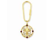 This elegant and ornate keychain pendant showcases four petite crosses set with clear crystals embracing a fleur de lis. The outer ring contains four Swarovski elements crystals in a rich ruby-red color.