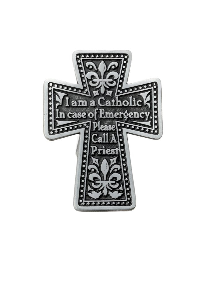 - Inscription reads "I am a Catholic In case of Emergency Please Call A Priest"
