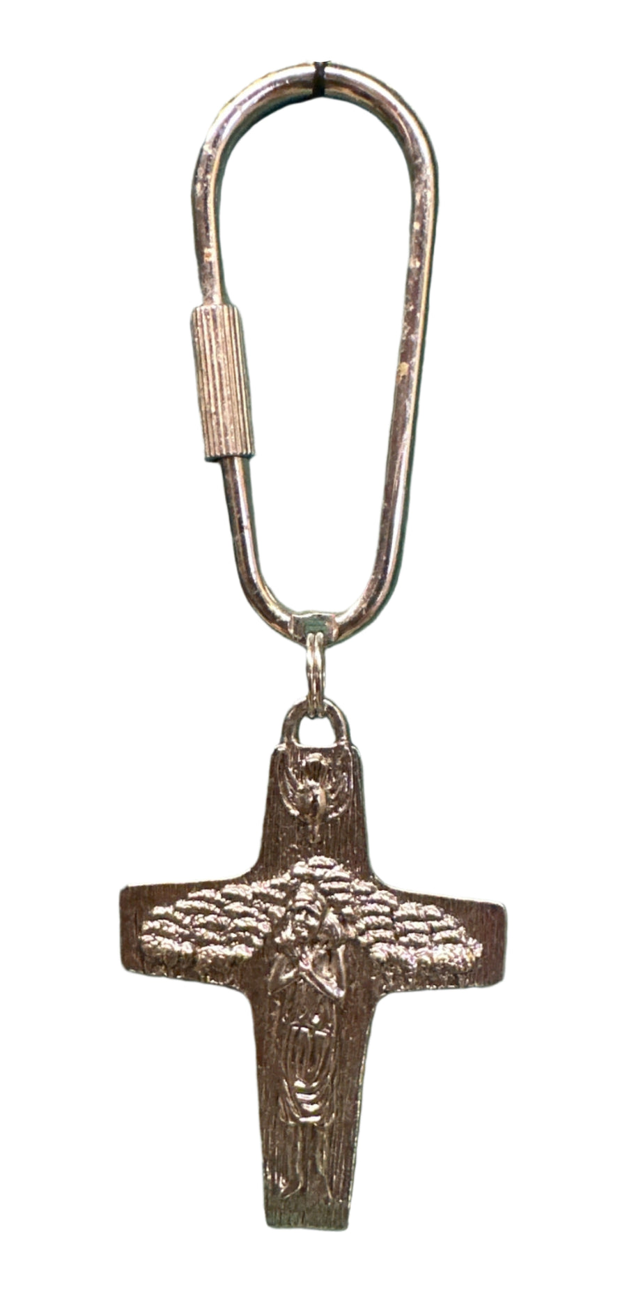 Featuring a silver-tone cross with an embossed image of a shepherd and sheep. A replica designed after the same cross that Pope Francis frequently wears.