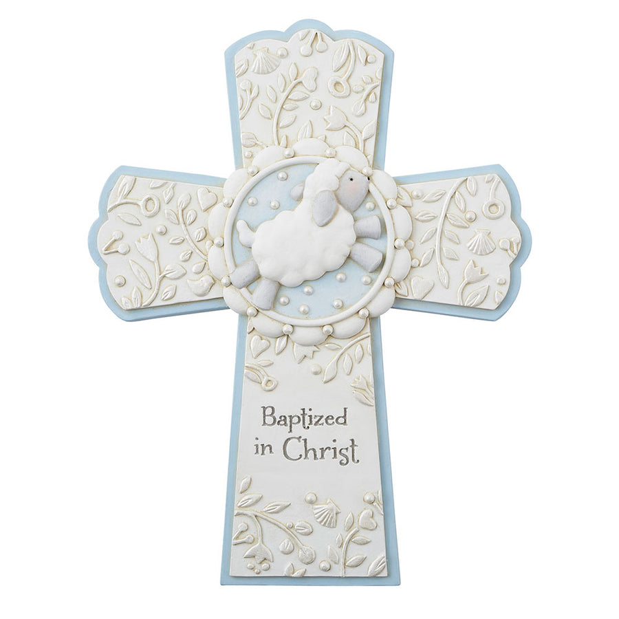 The blue Cross is made of polyresin with the image of a sheep and inscribed with the words - Baptized in Christ with a keyhole back for ease of hanging. This blue cross will add a touch of whimsical artistry to baby's room as it serves as a reminder of the blessings of his special day.