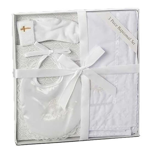 Set includes: One 8.5 inch long white satin bib with lace edge and cross embroidered front; a pair of socks with gold cross embroidered at the ankles; and a 40x40 inch poly/cotton blanket with cross and scroll embroidery.