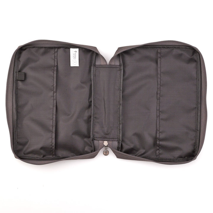 The back panel has a slip pocket. The sewn-in lay-flat spine handle ensures the Bible cover opens all the way and lays flat. Inside is a pen loop, and a cross engraved zipper pull securely closes the cover.