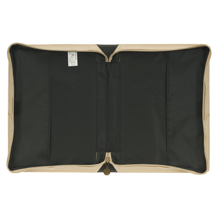 The metallic taupe back cover features a slip pocket that is heat-debossed with a beautiful floral design. A taupe zipper has an antique gold zipper pull that securely closes the covers to protect the contents. Antique gold handle hardware secures a lay-flat handle that folds completely flat when the cover is open. For added convenience, two interior pen loops mean you will always have a writing instrument handy for taking notes during sermons or study sessions.