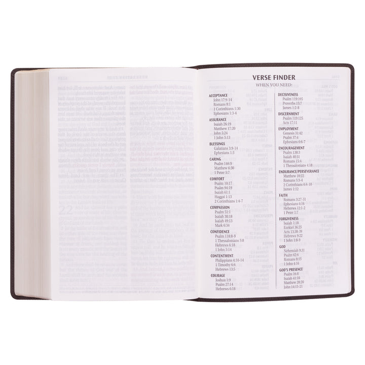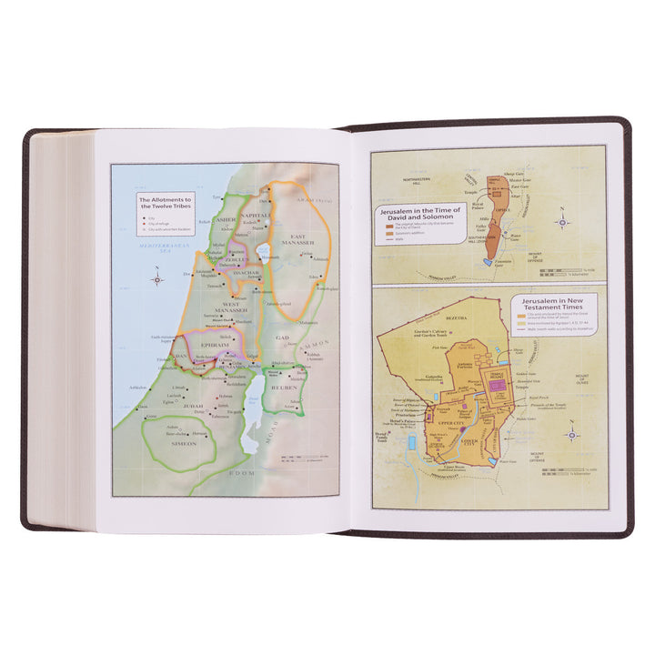 Topstitching around the edges of the Bible lends durability and strength to the design. With an easy-to-read 17-point type in a double-column format and footnote cross-reference guide, concordance, and thematic Scripture verse finder, you'll find this Bible an excellent tool for study and readable without strain. The words of Christ are printed in red ink, and there are eight full-color annotated biblical maps.