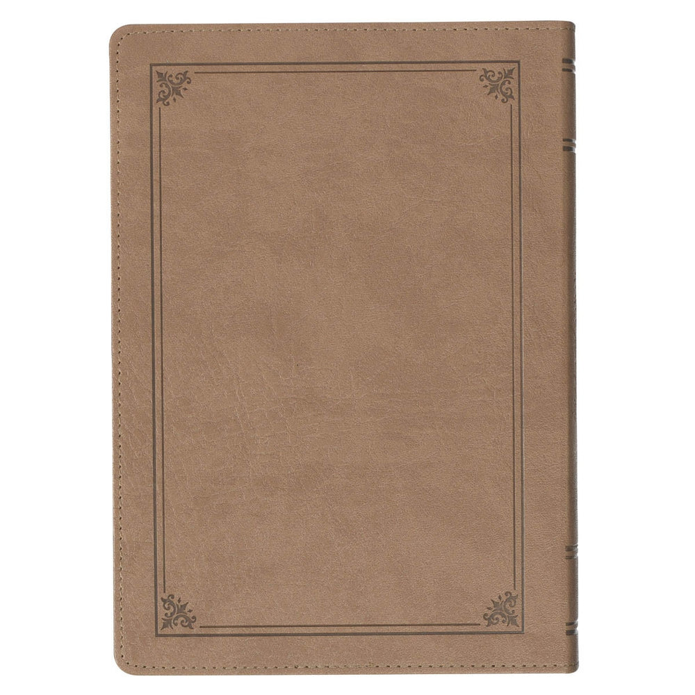 The Bible is covered in a beautiful tan faux leather, and gold gilt-edging is applied to the page edges. A heat-debossed frame with corner scroll designs embellishes both covers, and the spine features the title and two sets of heat-debossed faux spine ribs. The title is heat-debossed inside the frame on the front cover.