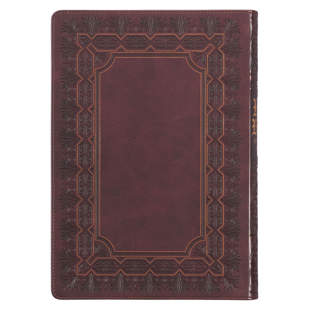 The super giant print Bible features smooth front and back faux leather covers adorned with exquisite gold-foiled frames. The design is further enhanced with Greek-themed heat-debossed fern and scroll work, lending a captivating depth to its appearance. The front cover showcases a gold-foiled title presented in a stylish Old English font, complemented by a heat-debossed design and the version reference.
