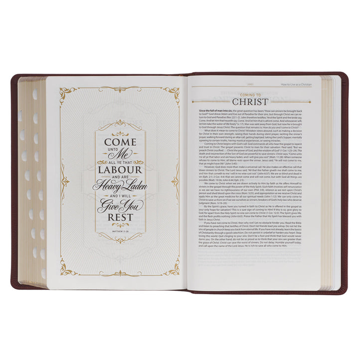 Study features abound, including an introduction for every book of the Bible. Most chapters end with a personal or family devotion, and thousands of explanatory study notes on the text and archaic language are included. Essays exploring 50 key teachings of the Bible, a concordance, and 8 full-color maps will create context and help your study. Furthermore, a dedicated section covers essential aspects of life as a Christian through 37 insightful essays.