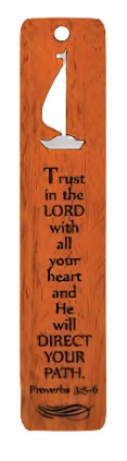 5" mahogany bookmark with 5" gold tassel. With laser cut lettering and cut-out sail boat.