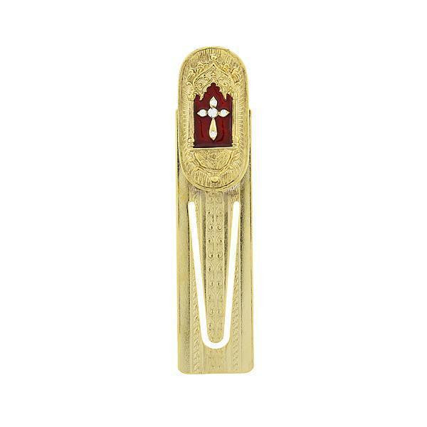 A 14k gold-dipped bookmark featuring a beautifully detailed replica of an alter adorned with a crystal embellished cross with rich red enamel accents. This bookmark will inspire and boost your mood. It makes a perfect and affordable gift for a teacher. A favorite gift for book club friends and librarians. Comes packaged in a Symbols of Faith gift box.