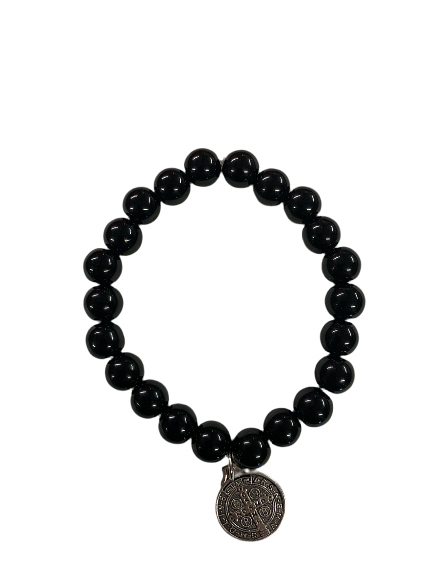 10mm Black Agate beads with a silver St. Benedict bracelet