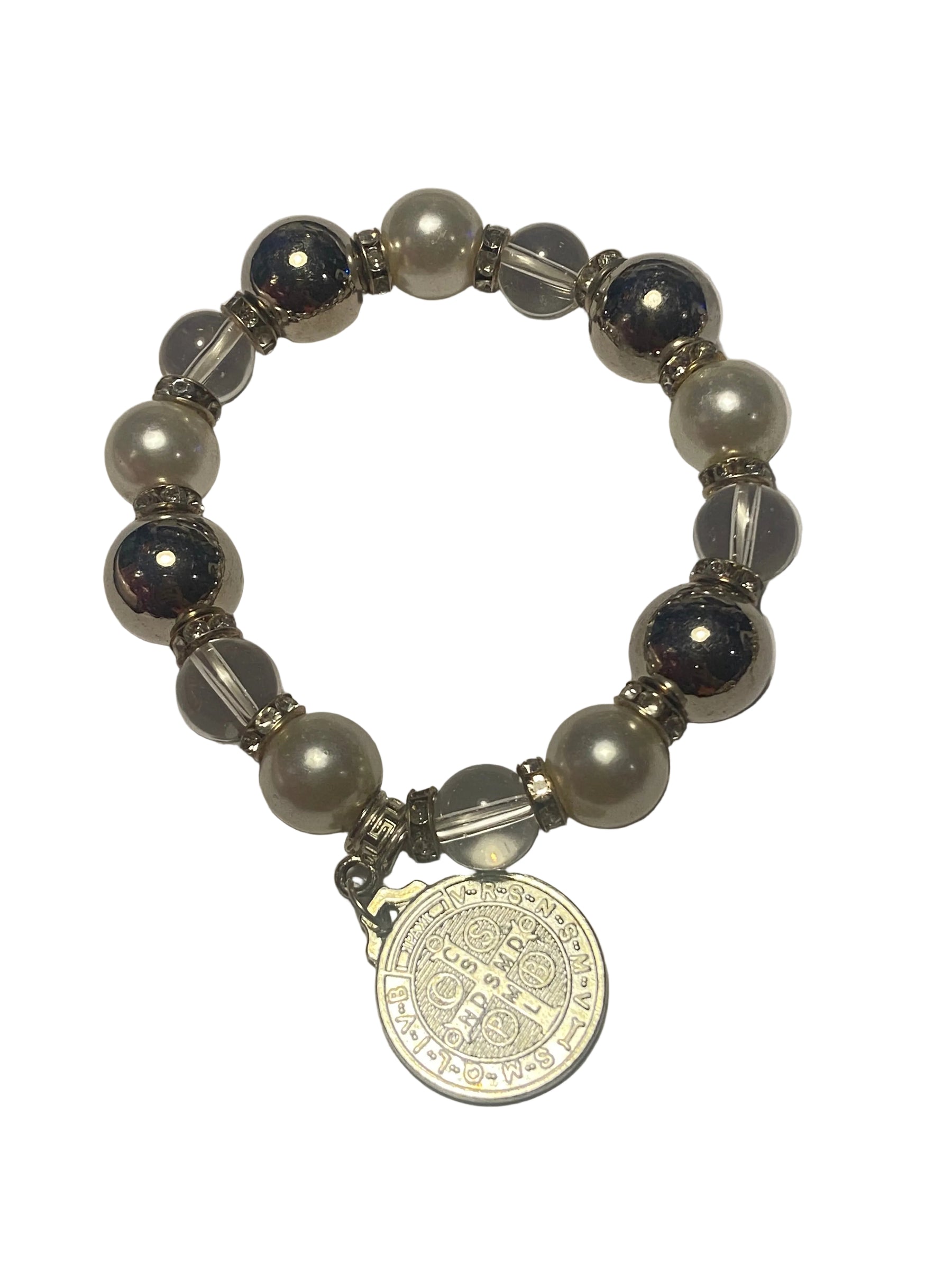 St. Benedict Medal Stretch Bracelet. Faux pearl, clear beads and either gold or silver beads and St. Benedict Medal.