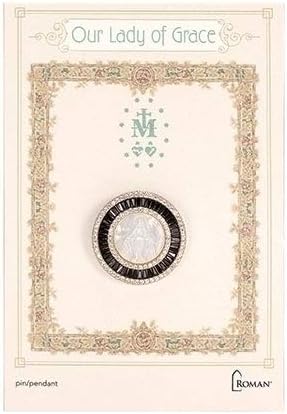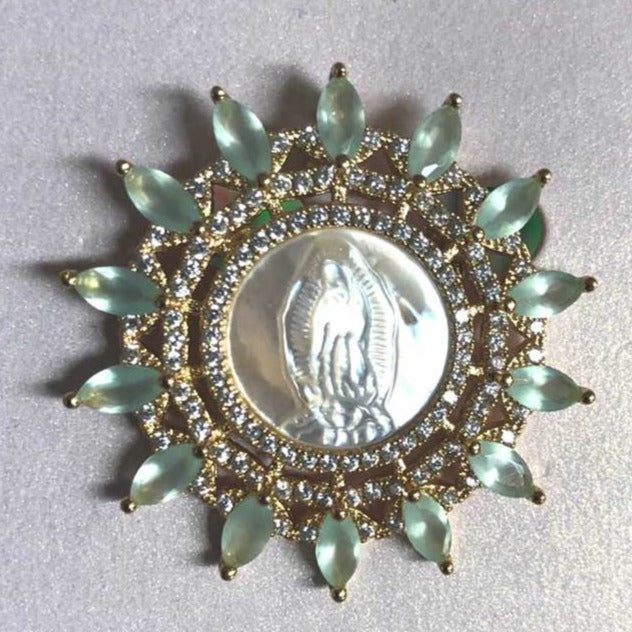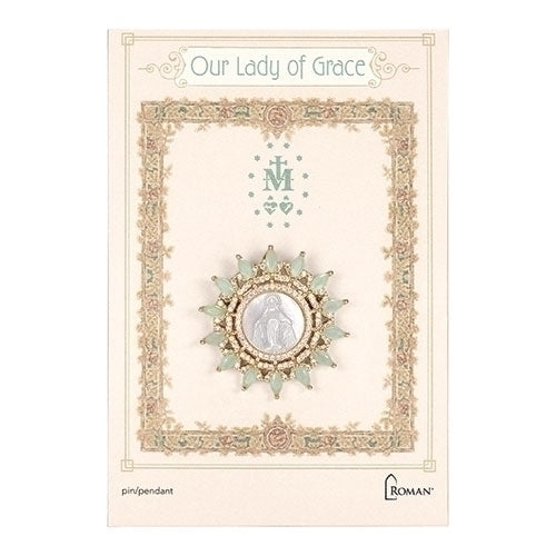 This beautiful Our Lady of Grace piece can be worn as a brooch or as a necklace by lacing it on your favorite chain. Crafted of brass with rhodium/silver or 18k gold finish. Natural shell any cubic zirconia accents.