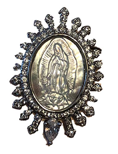 This beautiful Our Lady of Grace piece can be worn as a brooch or as a necklace by lacing it on your favorite chain. Crafted of brass with rhodium/silver or 18k gold finish. Natural shell any cubic zirconia accents.
