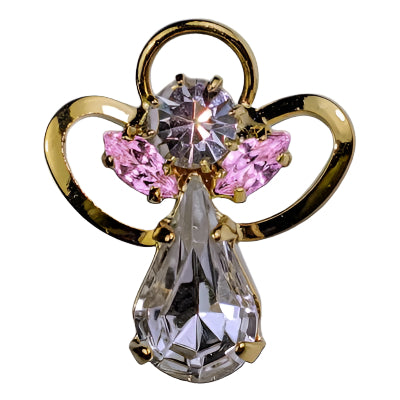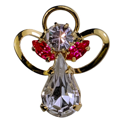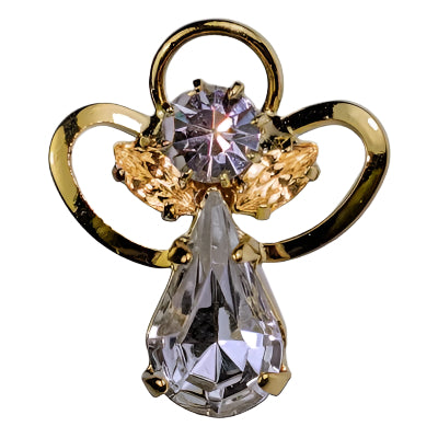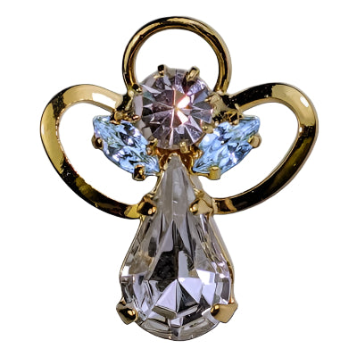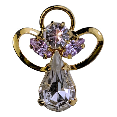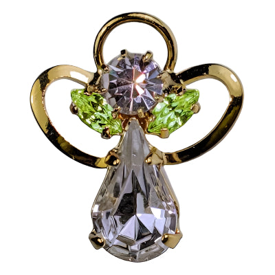 This gorgeous Guardian Angel Birthstone pin measures one inch tall and is finished in a polished gold tone. Made with cubic zirconia, this beautiful pin has a clear teardrop body and round face. The wings depict the birthstone color. Makes a nice gift for children and adults alike.
