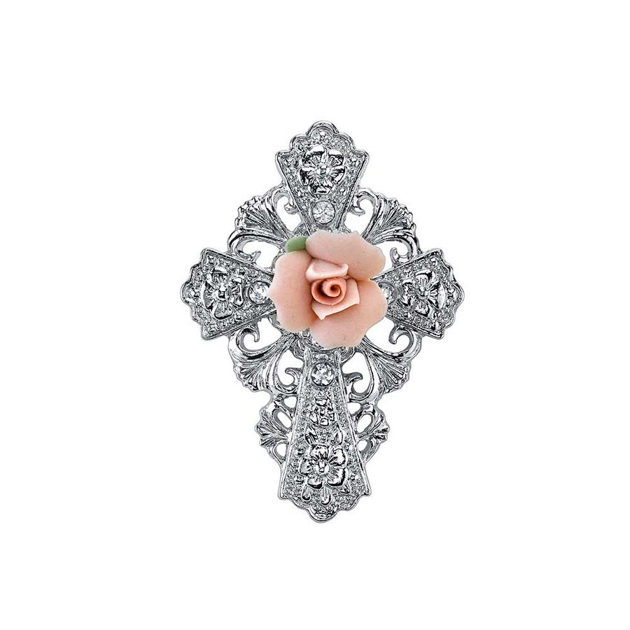 This fancy silver tone and floral cross brooch is embedded with four crystals surrounding a pink porcelain rose. Comes packaged in a Symbols of Faith gift box.