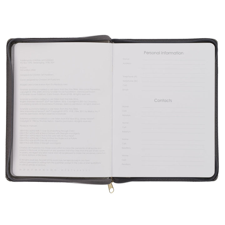 A crises Scripture guide in the back of the planner lists Bible verses according to the topic. It also includes space to record the names and addresses of friends and family.
