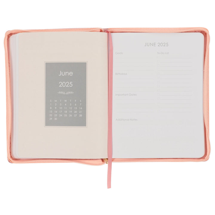 A matching coral zipper enclosure binds both covers with a gold zipper pull to accent. A satin ribbon marker is attached to the spine to mark your page, and the interior pages are printed in two colors.