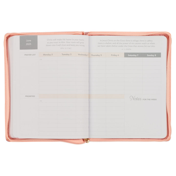 Each weekly planning page has space to note your prayers and priorities. Days are broken into morning and afternoon sections with ample room to record appointments. A Scripture verse at the top of the page is alternated with a quote on every second page. Weekend days are less regimented but still offer plenty of space to record appointments. A dotted section is included to doodle, list, or draw.