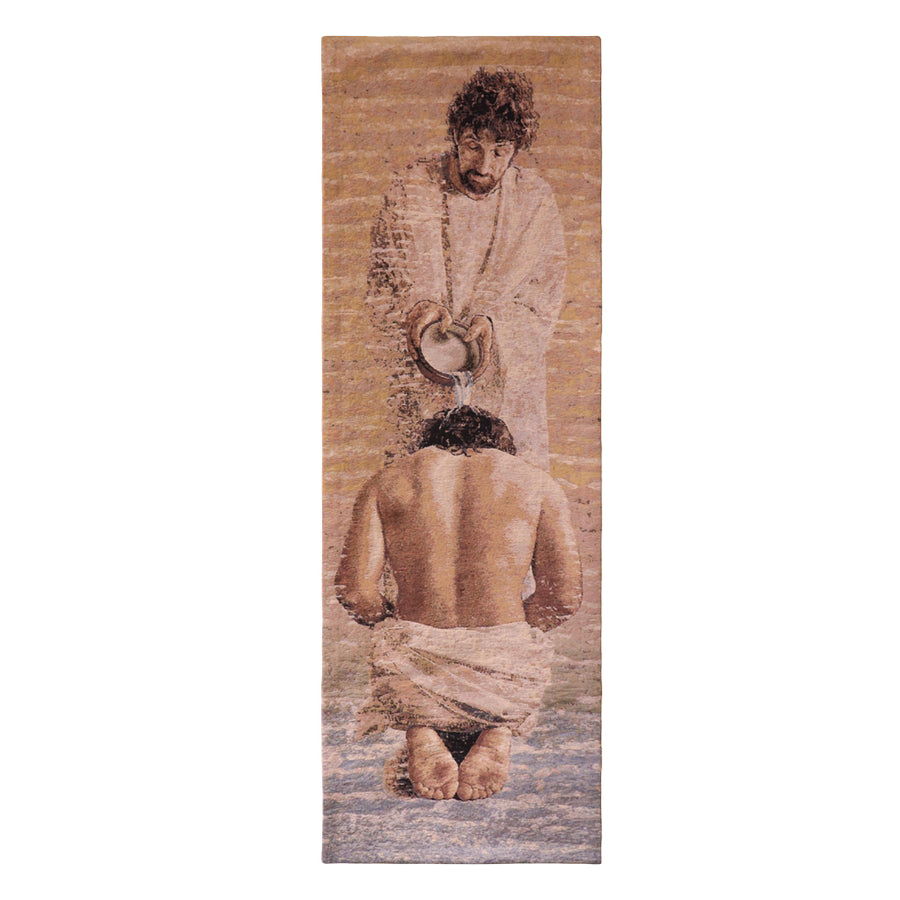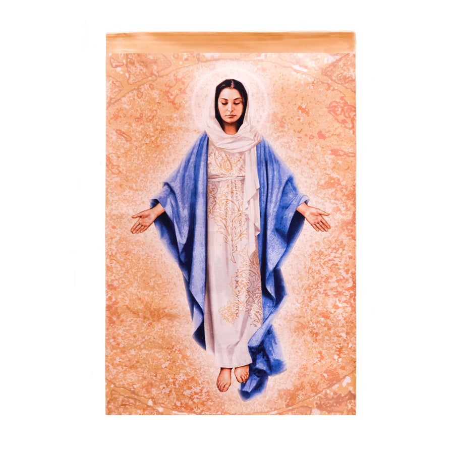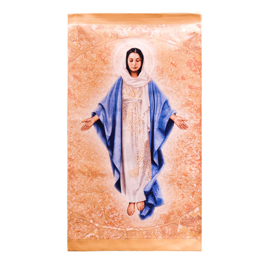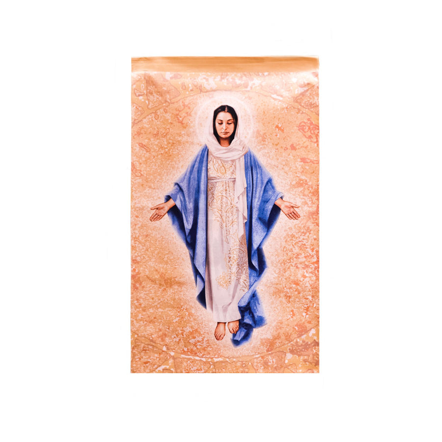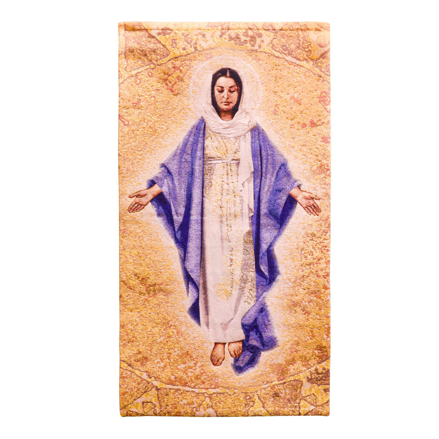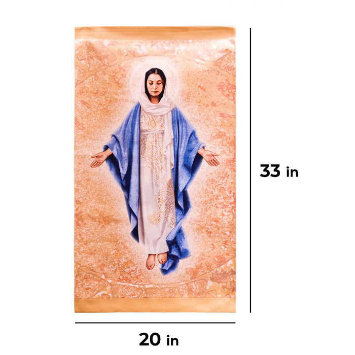 The large Blessed Mother print tapestry includes an upper and lower sleeve for hanging rods as well as loops for hanging with hooks and cord.