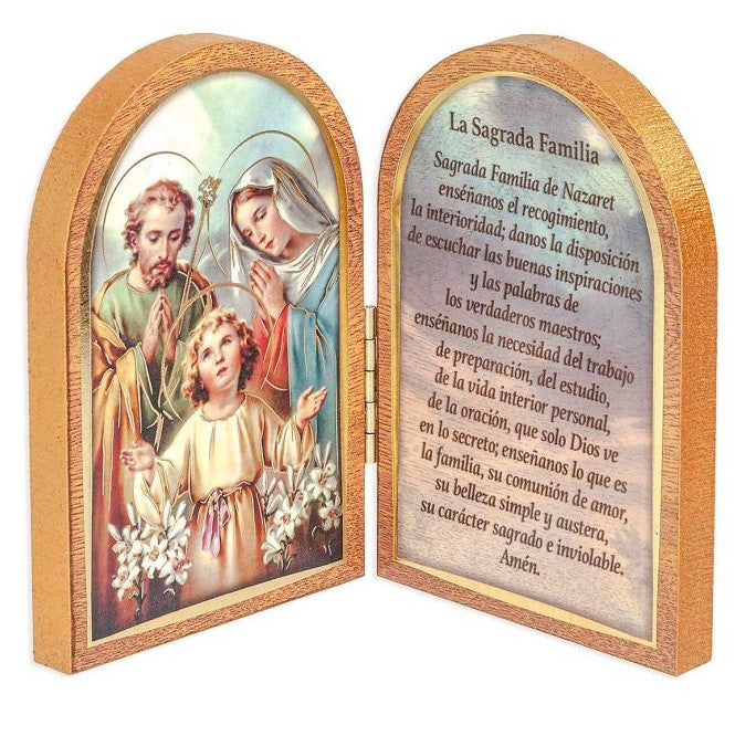 3.5" Holy Family Standing Natural Wood Diptych in Spanish