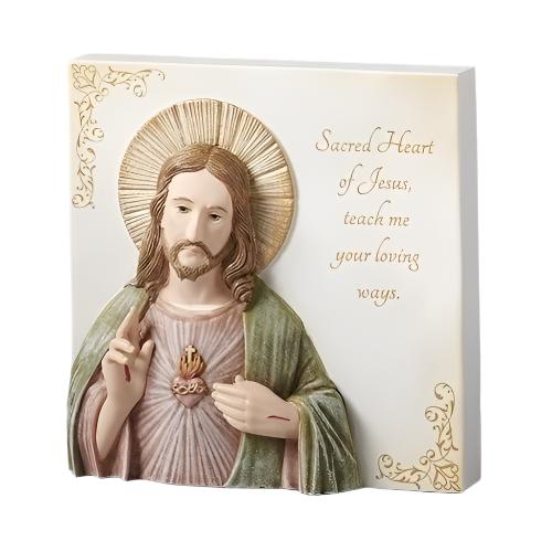 This exquisitely crafted plaque features a three-dimensional depiction of Sacred Heart of Jesus, surrounded by delicate detailing that enhances its spiritual presence.
