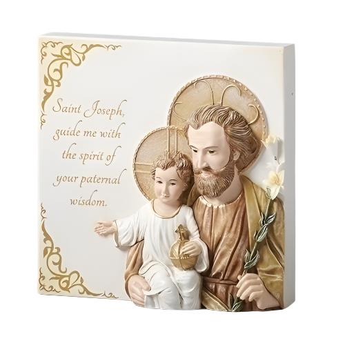 This beautifully designed plaque features a three-dimensional portrayal of St. Joseph, honoring his role as the protector of families and workers.