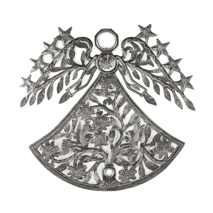 A wonderful piece that you will be proud to show in your home, this hanging metal Angel was hand cut from a flattened 55 gallon steel oil drum. All of the details for the piece are expertly worked by the artist, with hammer and chisel, into a beautiful piece of collector quality Haitian steel drum art.