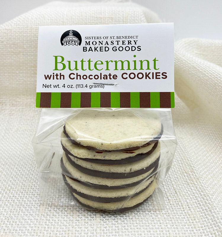 Our minty buttermint cookies plus the addition of a layer of dark chocolate makes these cookies even more irresistible. Made by the Sisters of St. Benedict as part of the Monastery Baked Goods line. 4 oz. package.