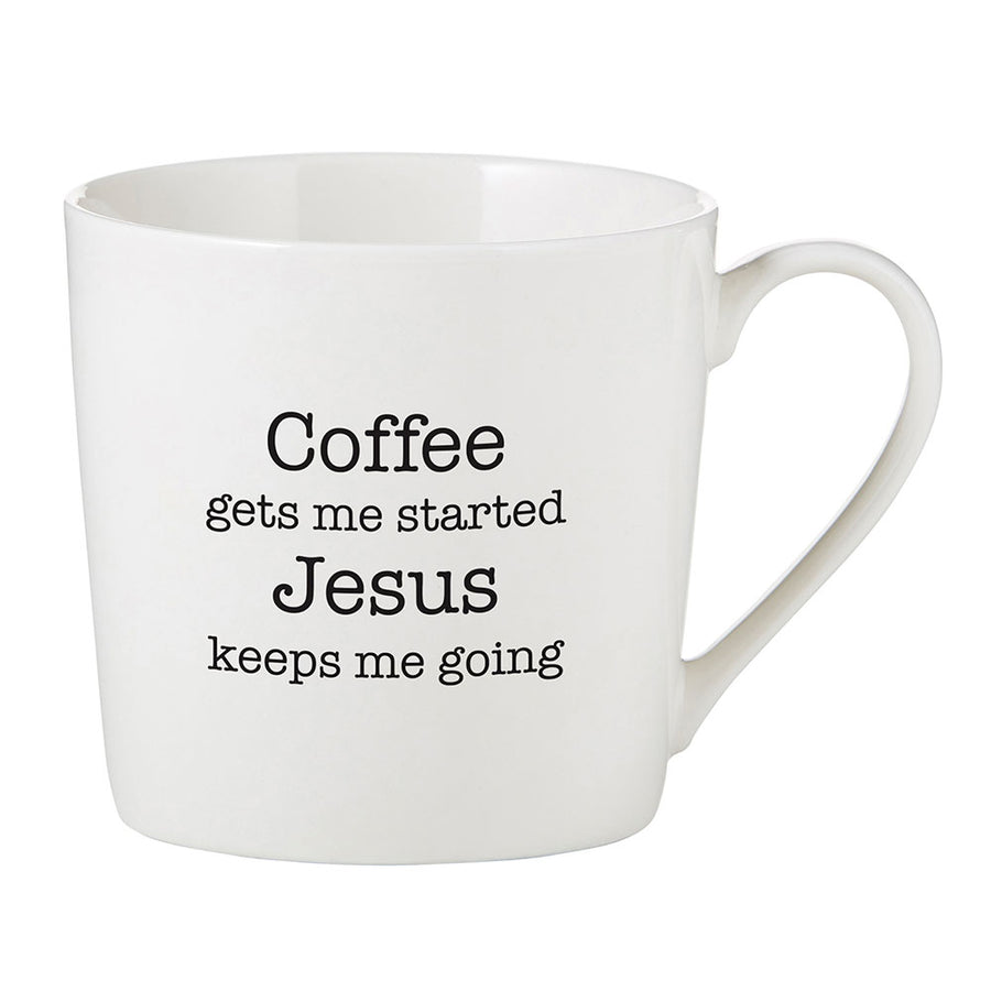 Make every sip a memorable one with this signature style cafe mug, featuring the phrase, "Coffee gets me started, Jesus keeps me going." Each is individually boxed and makes a great gift! Lightweight and durable, microwave and dishwasher safe.