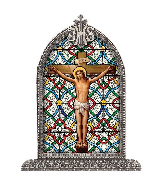 6.5" Crucifixion Silver Stain Glass Arch Plaque