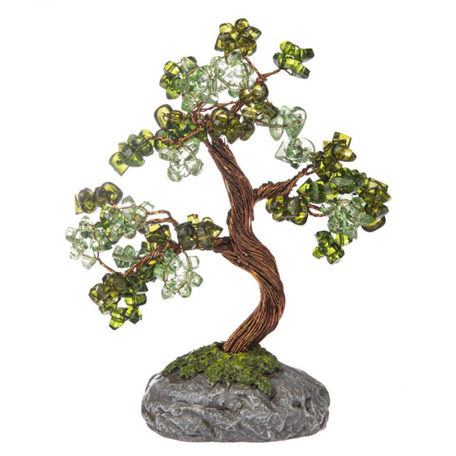 - Eye-catching design features a mounted wire wrapped tree trunk with light-catching beads in various shades of green