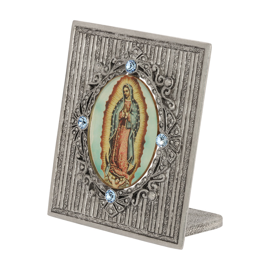A classic and beautifully made vintage inspired designed table pewter plaque featuring an oval decal of Our Lady of Guadalupe accented by brilliant clear European crystals. This table plaque makes a great gift for anytime of the year!