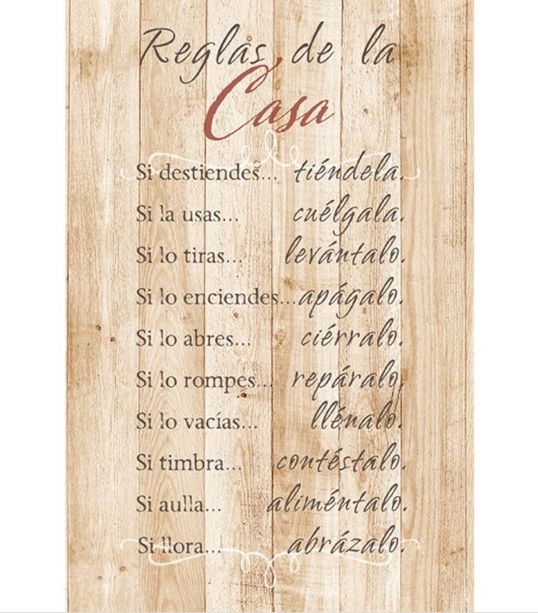 The sentiment on the plaque reads: "Reglas de la Casa: Si destiendes... tiéndela, Si la usas... cuélgala, Si lo tiras... levantalo, Si lo enciendes... apagalo, Si lo abres... ciérralo, Si lo rompes... reparalo, Si lo vacias... llénalo, Si timbra... contéstalo, Si aulla... aliméntalo, Si llora... abrazalo."