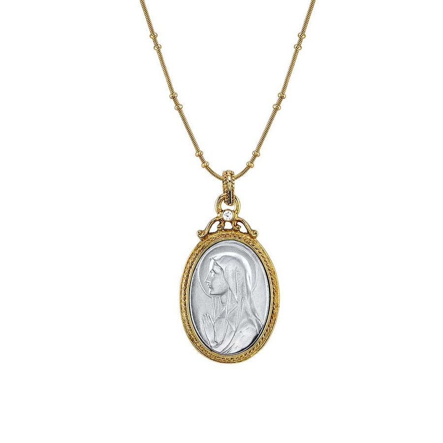 Two Tone Virgin Mary Medallion with Crystal Accent Pendant Necklace