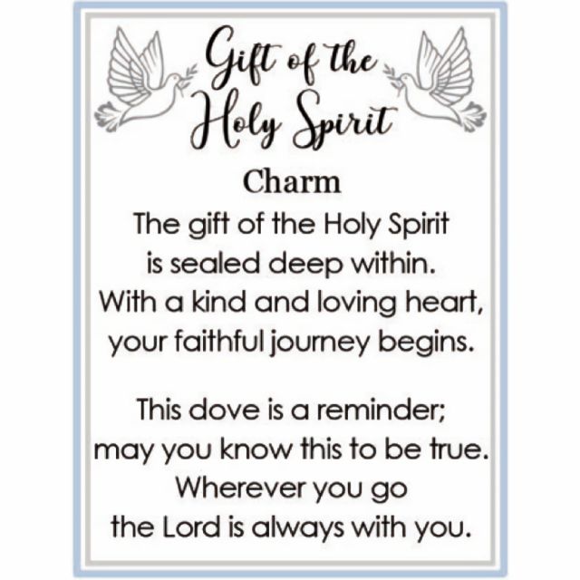 The gift for the Holy Spirit is sealed deep within. With a kind and loving heart, your faithful journey begins. This dove is a reminder; may you know this to be true. Wherever you go the Lord is always with you.