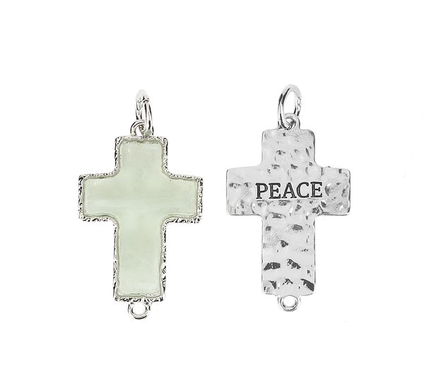 2" Ornate silver plated cross charm with green enamel face and "Peace" engraved on the back