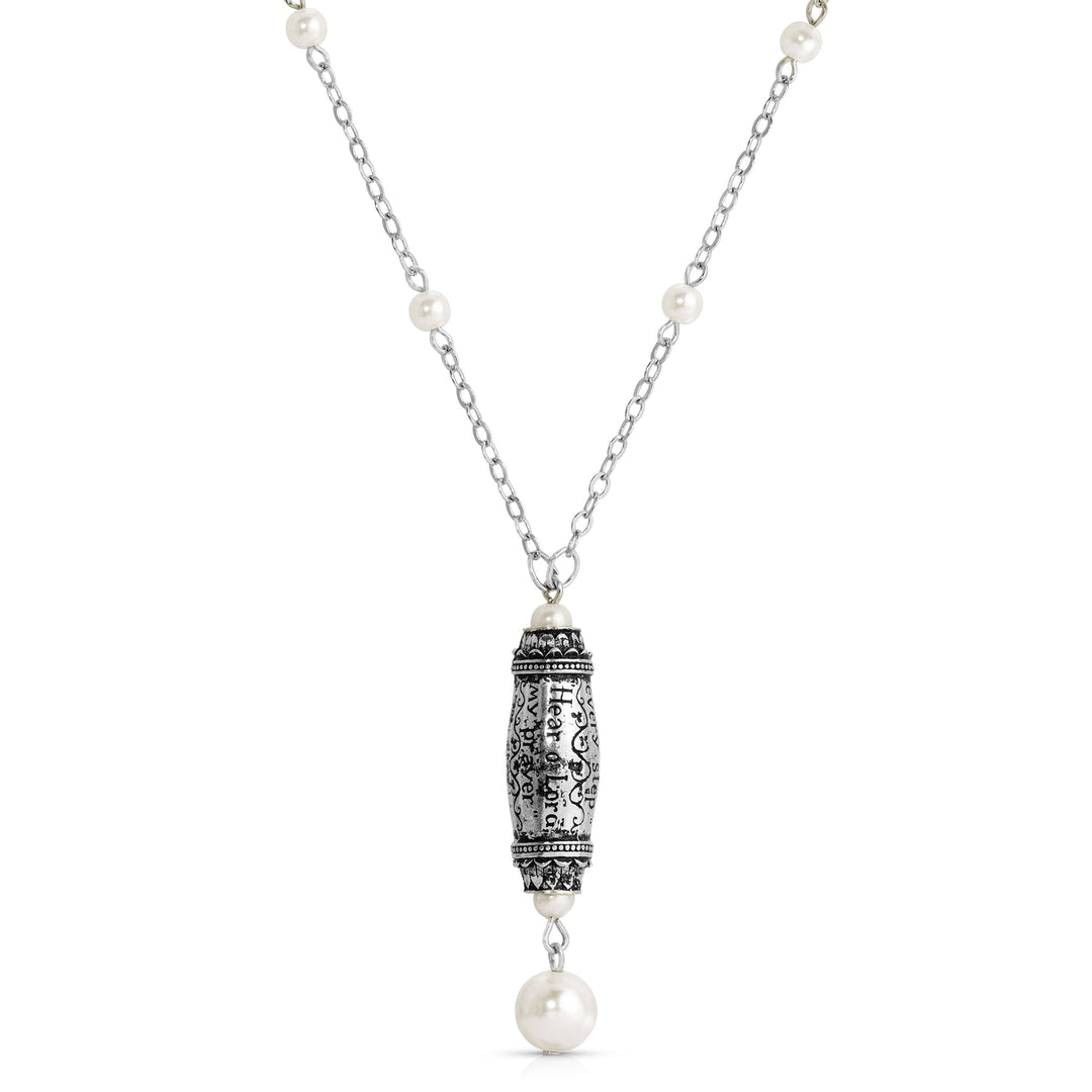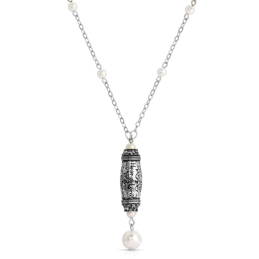 Take a bit of the faith everywhere you go with this beautifully made scroll scripture necklace. Featuring three snippets of Psalms, "Hear Or Lord My Prayer", "The Lord Is Our Shield" and "Do Not Fear, The Lord Is With You At Every Step". The pewter pendant dangles elegantly from a silver tone cable chain with white costume pearls. This necklace comes with a 1928 logo tag and lobster clasp closure for a secure fit.